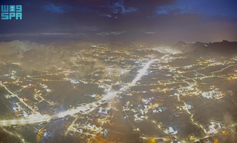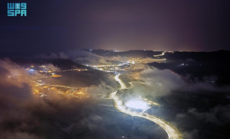 وتتنوع المشاهد بين مدن عسير، ففي أبها تبدو شبكة الطرق الرئيسة كأنها خيوط مضيئة تخترق السحب، بينما تبرز تنومة بجبالها التي تحتضن الضباب لتمنحه طابعًا مبهرًا، وتظهر النماص بانوراما تجمع بين البيوت المضيئة والأودية المغطاة بالغيم، في لوحة متكاملة تعكس دفء المكان وروح الضيافة.