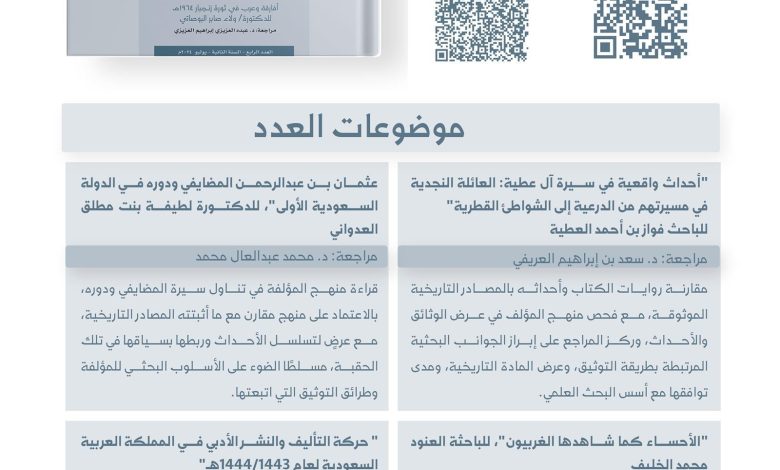 وتضمن العدد الجديد، باقة من المراجعات المتنوعة، استهلها الدكتور سعد بن إبراهيم العريفي بمراجعة لكتاب “أحداث واقعية في سيرة آل عطية العائلة النجدية في مسيرتهم من الدرعية إلى الشواطئ القطرية” للباحث فواز بن أحمد بن حمد آل عطية، حيث قارن المُراجع روايات الكتاب وأحداثه بالمصادر التاريخية الموثوقة، مع فحص منهج المؤلف في عرض الوثائق، والأحداث، مركزًا على إبراز الجوانب البحثية المرتبطة بطريقة التوثيق، وعرض المادة التاريخية، ومدى توافقها مع أسس البحث العلمي.