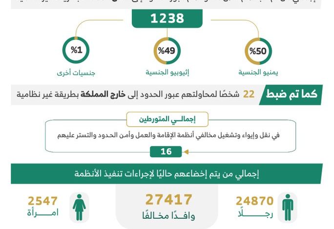 ثانيًا: بلغ إجمالي من تم ضبطهم خلال محاولتهم عبور الحدود إلى داخل المملكة (1238) شخصًا (50%) منهم يمنيو الجنسية، و(49%) إثيوبيو الجنسية، وجنسيات أخرى (01%)، كما تم ضبط (22) شخصًا لمحاولتهم عبور الحدود إلى خارج المملكة بطريقة غير نظامية.