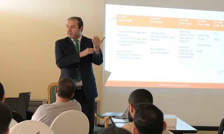 وتضمنت الدورة, تسجيل اللاعبين وإدارتهم، والجوانب القانونية للبطولات المحلية والدولية، ونظام التحكيم بالفيديو، وبرامج إدارة التحكيم وجدولة المنافسات والتصنيف، وشرح أنظمة تحكيم أسلحة الإبيه والسايبر والفويل.