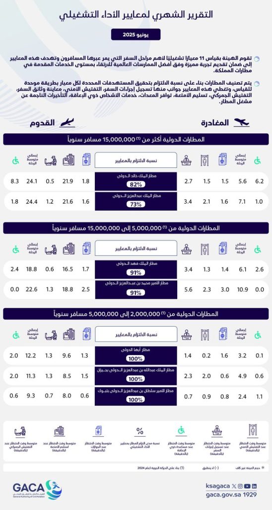 أصدرت الهيئة العامة للطيران المدني اليوم، تقريرها الشهري عن أداء مطارات المملكة الدولية والداخلية، لشهر يوليو (2025)م، وفقًا لـ(11) معيارًا أساسيًّا لقياس الأداء، تطبيقًا للتوجُّهات الإستراتيجية، التي تستهدف تجويد الخدمات المُقدَّمة للمسافرين، ورفع مستواها، وتحسين تجربة المسافر في مطارات المملكة.