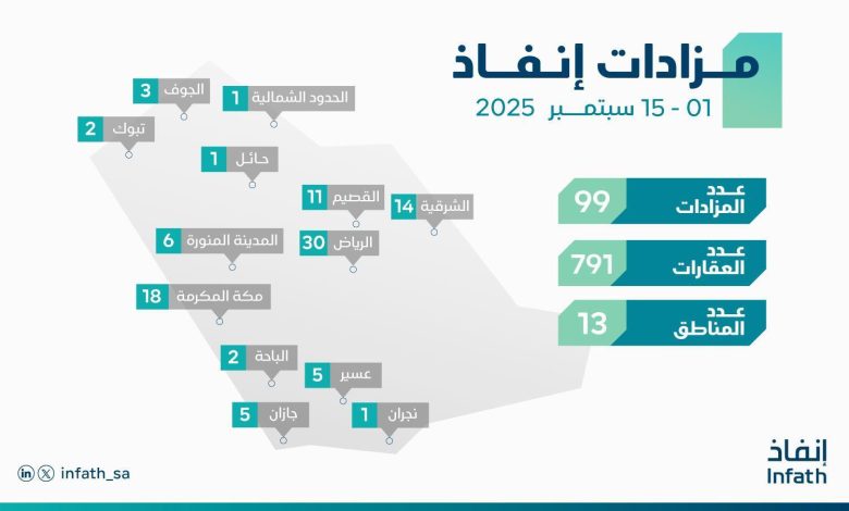 وأكد “إنفاذ” أن جميع تفاصيل المزادات وشروط المشاركة متاحة عبر صفحة المزادات على الموقع الإلكتروني الرسمي:www.infath.gov.sa.