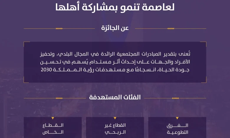وأتاحت “الأمانة” منصة رقمية للجائزة عبر الرابط (https://azwahaward.alriyadh.gov.sa/) تتضمن آلية متكاملة للتسجيل واستعراض المبادرات، وتمنح المشاركين فرصة متابعة مسار مبادراتهم منذ التقديم حتى إعلان النتائج، وتجمع الجائزة الأفراد والمنظمات والفرق التطوعية على أرضية مشتركة من الإبداع والمشاركة المجتمعية الفاعلة، وتهدف إلى رفع الوعي بأهمية المشاركة المجتمعية ودورها في تحسين جودة الحياة في مدينة الرياض، بما يتماشى مع رؤية المملكة، من خلال تسليط الضوء على المبادرات المبتكرة وقصص النجاح، كما تسعى إلى تشجيع المزيد من الأفراد والمؤسسات على المشاركة الفاعلة في تطوير مجتمعهم المحلي، وتوثيق أثر العمل التطوعي في المجال البلدي، إلى جانب تعزيز الشراكة بين القطاعات المختلفة.