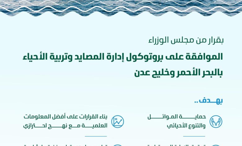 جاء ذلك عقب صدور موافقة مجلس الوزراء يوم أمس على البروتوكول بهدف تحقيق الإدارة المستدامة للموارد الحية، وحماية الموائل والتنوع الأحيائي، وتطوير مبادئ وتدابير فنية وإرشادية للصيد الرشيد والاستزراع المائي، وبناء القرارات على أفضل المعلومات العلمية مع نهج احترازي.