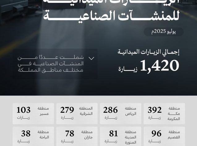 وأوضح المتحدث الرسمي لوزارة الصناعة والثروة المعدنية جراح الجراح؛ أنَّ الزيارات الميدانية المُنفَّذة خلال شهر يوليو 2025، شملت (392) زيارة للمصانع في منطقة مكة المكرمة، و(286) زيارة في منطقة الرياض، و(279) زيارة في المنطقة الشرقية، إضافة إلى (103) زيارات في منطقة عسير، و(96) زيارة في منطقة القصيم، و(81) زيارة في منطقة المدينة المنورة، و(78) زيارة في منطقة جازان، و(38) زيارة في منطقة الباحة، و(22) زيارة في منطقة تبوك، و(22) زيارة في منطقة نجران، و(19) زيارة في منطقة الجوف، فيما نفذت (4) زيارات في منطقة حائل.