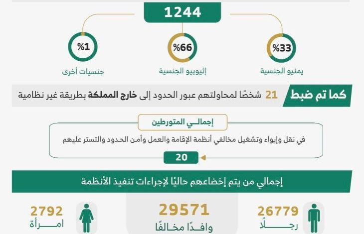 ثانيًا: بلغ إجمالي من تم ضبطهم خلال محاولتهم عبور الحدود إلى داخل المملكة (1244) شخصًا (33%) منهم يمنيو الجنسية، و(66%) إثيوبيو الجنسية، وجنسيات أخرى (01%)، كما تم ضبط (21) شخصًا لمحاولتهم عبور الحدود إلى خارج المملكة بطريقة غير نظامية.