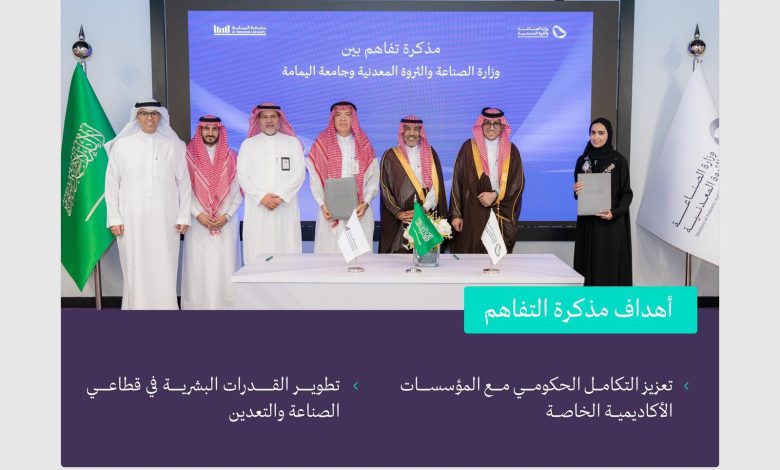 أبرمت وزارة الصناعة والثروة المعدنية مذكرة تفاهم مع جامعة اليمامة؛ تستهدف تطوير القدرات البشرية في قطاعي الصناعة والتعدين، وتعزيز التكامل الحكومي مع المؤسسات الأكاديمية الخاصة، في مجالات التدريب، والبحث العلمي، ونقل المعرفة، بما يحقق أهداف التنمية المستدامة، ويتسق مع رؤية المملكة 2030.