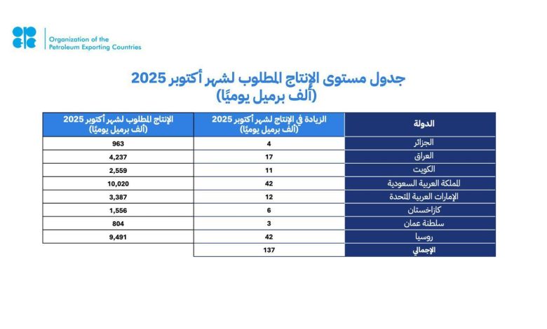 وفي ضوء النظرة المستقرة للاقتصاد العالمي وأسس السوق الإيجابية الحالية، كما يتضح من انخفاض المخزونات البترولية، قررت الدول المشاركة تنفيذ تعديل في الإنتاج قدره 137 ألف برميل يوميًا من إجمالي كميات التعديلات التطوعية الإضافية البالغة 1.65 مليون برميل يوميًا، والتي أُُعلن عنها في أبريل 2023م، وسيُنفذ هذا التعديل في أكتوبر 2025م، وفقًا لما هو مبينٌ في الجدول أدناه.