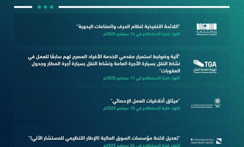 وتضمنت المشروعات المطروحة عبر المنصة، مشروع (اللائحة التنفيذية لنظام الحرف والصناعات اليدوية)؛ الذي تهدف من خلاله وزارة الثقافة إلى تعزيز نشاط الحرف والصناعات اليدوية ذي الصلة بالتراث الثقافي الوطني المتوارث، والمحافظة عليه، وينتهي الاستطلاع على المشروع بتاريخ 16 سبتمبر 2025م.