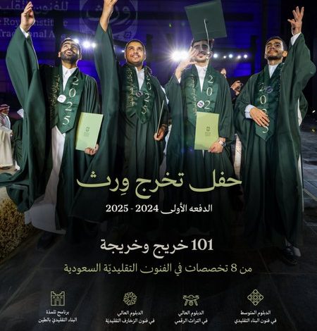 واحتفى المعهد خلال الحفل بتخريج (101) طالب وطالبة يمثلون الدفعة الأولى من مختلف البرامج التعليمية والتدريبية التي يقدمها، بما في ذلك برامج التلمذة والبرامج الأكاديمية التي تُعنى بمجالات مثل البناء التقليدي بالطين، وصناعة الأبواب النجدية، والنسيج التقليدي (السدو)، والبشت الحساوي، إلى جانب برامج الدبلوم العالي في فنون الزخارف التقليدية، وتطوير المنتجات، والتراث الرقمي.
