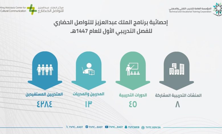 وشاركت (8) منشآت تدريبية نفذت (45) دورة تدريبية متنوعة في مجالات الحوار والتوعية المجتمعية، استفاد منها (4284) متدربًا ومتدربة، وركزت محاور البرامج التدريبية على تعزيز الهوية الوطنية، وتنمية ثقافة الحوار، والقدرة على التعايش الإيجابي داخل المجتمع، بما يسهم في حماية الشباب من الأفكار السلبية وترسيخ القيم الأصيلة.
