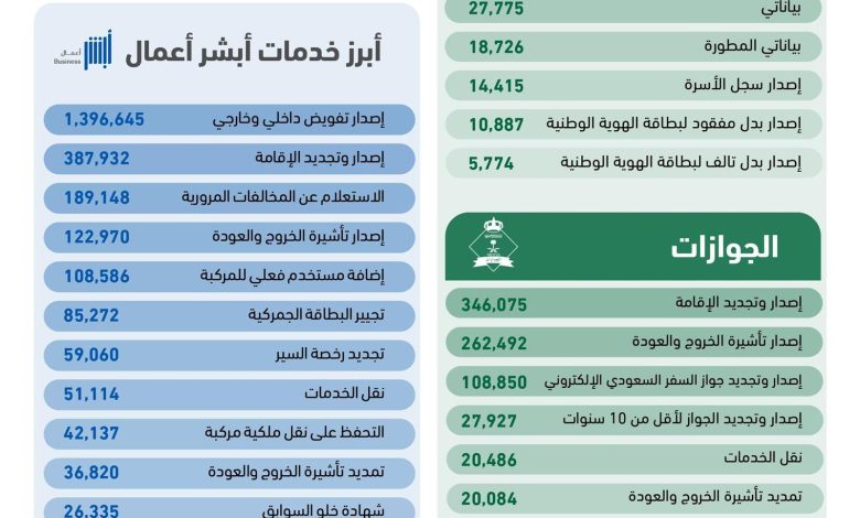وعبر الخدمات العامة في منصة أبشر أفراد، تم إصدار (113.918) تقريرًا في خدمة تقارير أبشر، و(3.488) طلبًا لتوصيل الوثائق بالبريد، و(2.185) استفسارًا عامًا عن البصمة.