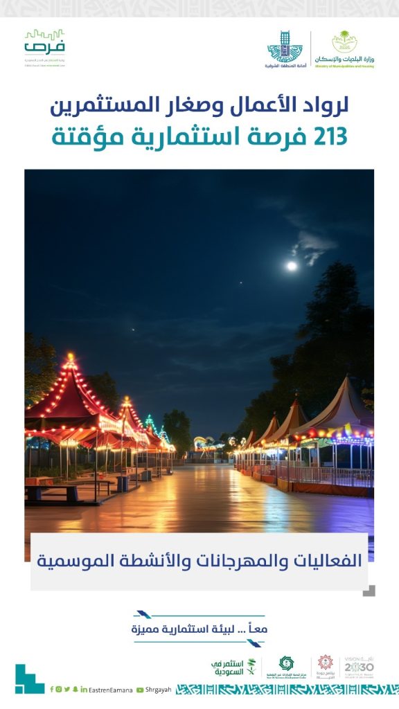 أمانة الشرقية تطرح 213 فرصة استثمارية موسمية لدعم رواد الأعمال وتنشيط السياحة