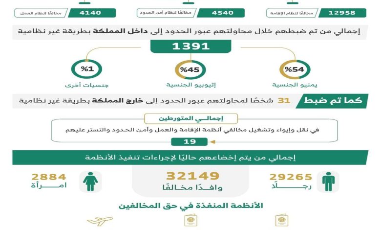 ثانيًا: بلغ إجمالي من تم ضبطهم خلال محاولتهم عبور الحدود إلى داخل المملكة (1391) شخصًا (54%) منهم يمنيو الجنسية، و(45%) إثيوبيو الجنسية، وجنسيات أخرى (01%)، كما تم ضبط (31) شخصًا لمحاولتهم عبور الحدود إلى خارج المملكة بطريقة غير نظامية.