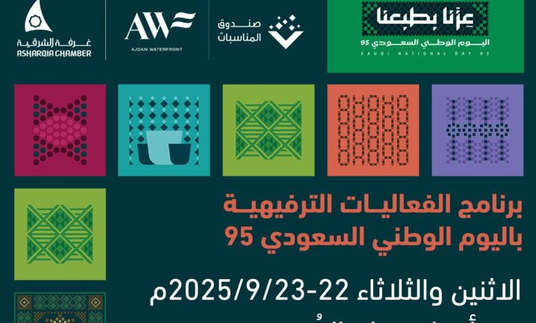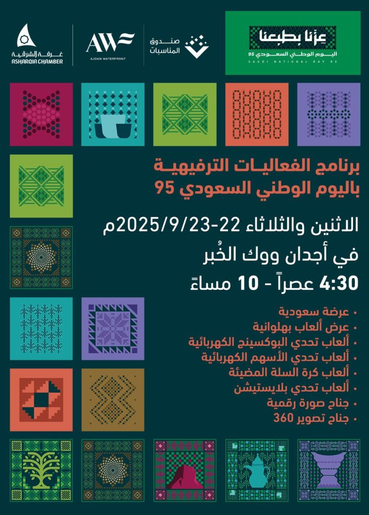 بمناسبة اليوم الوطني السعودي الـ95، ينظم صندوق المناسبات بغرفة الشرقية فعاليات عائلية متنوعة، وذلك يومي الاثنين والثلاثاء 22 و23 سبتمبر، في واجهة أجدان ووك بالخبر، من الساعة الرابعة والنصف عصرًا وحتى العاشرة مساءً.