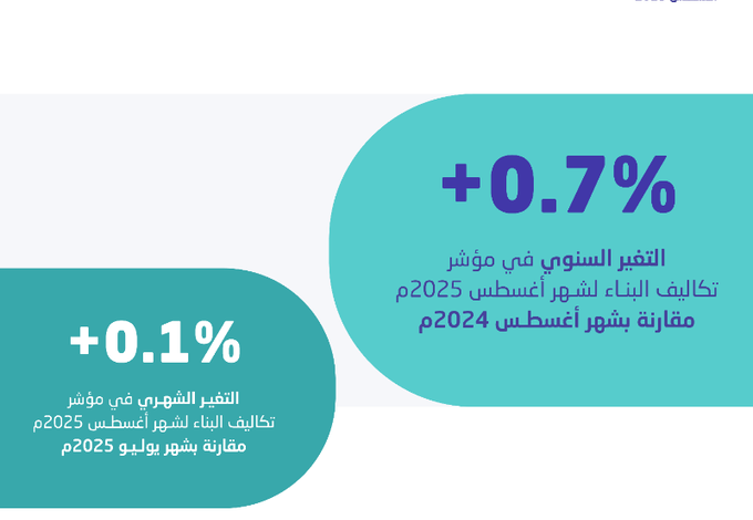 وعلى أساس شهري، سجلت تكاليف البناء في القطاع السكني ارتفاعًا طفيفًا نسبته (0.1%) خلال أغسطس 2025 مقارنةً بالشهر السابق من العام نفسه، في حين لم تشهد تكاليف القطاع غير السكني أي تغير مقارنةً بالشهر السابق.