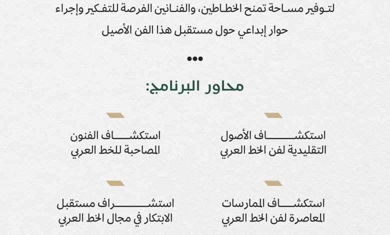 وتُغطي هذه النسخة من البرنامج، أربعة محاورٍ رئيسة، وهي: استكشاف الأصول التقليدية لفن الخط العربي، واستكشاف الفنون المصاحبة له، واستكشاف الممارسات المعاصرة لهذا الفن وتطوّره، واستشراف مستقبل الابتكار في مجاله، على أن يحظى المشاركون بفرصة التفاعل في ورش العمل المختلفة، والحوارات، والجلسات الإرشادية الفرديّة، والجولات الثقافيّة داخل جدة وخارجها، إضافة إلى زياراتٍ ميدانيّة لمراسم الفنانين، والخبراء المحليّين، ومعاملهم، مما يُعزّز التبادل المعرفيّ، والممارسات الفنّيّة المتجدّدة.