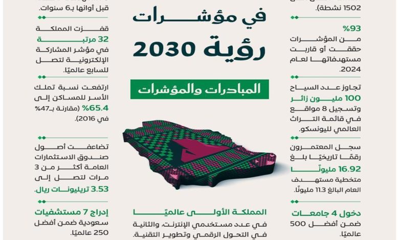 رؤية المملكة 2030 تُحقق أرقامًا قياسية بمؤشراتها ومستهدفاتها في اليوم الوطني الخامس والتسعين