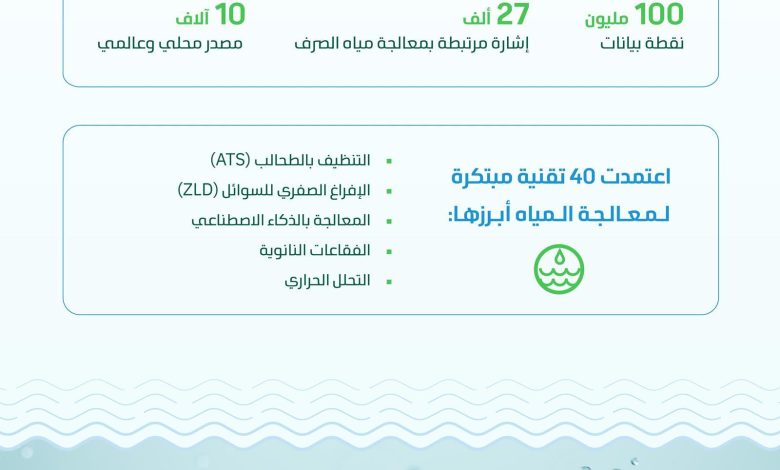 اعتمدت وزارة البيئة والمياه والزراعة (40) تقنية مبتكرة لمعالجة المياه وإعادة استخدامها أبرزها: التنظيف بالطحالب (ATS)، الفقاعات النانوية، الإفراغ الصفري للسوائل (ZLD)، والتحلل الحراري، والمعالجة المدعومة بالذكاء الاصطناعي، وذلك من خلال تحليل أكثر من (10) آلاف مصدر محلي وعالمي، شمل منشورات علمية وبراءات اختراع وتقارير قطاعية وأخبار، ومتابعة أكثر من (100) مليون نقطة بيانات.