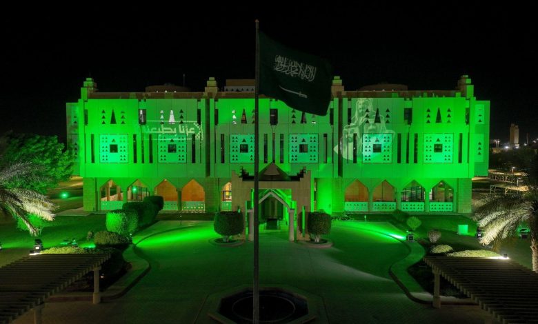 وغطت الإضاءة الخضراء كامل المبنى بجهاته الأربع، إضافة إلى المرافق المحيطة به مواكبةً للاحتفاء باليوم الوطني.
