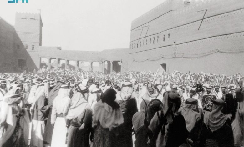 وفي 16 شوال 1349هـ/مارس 1931م وعقب استعراض الجيش السعودي الذي حضره الملك عبدالعزيز، تقدَّم الأمراء والأعيان بالسيوف والبنادق مُردّدين القصائد الحماسية على إيقاع الطبول أمام قصره بمكة المكرمة، في مشهد يجمع بين الفرح بالعيد، والتعبير عن الولاء والانتماء.