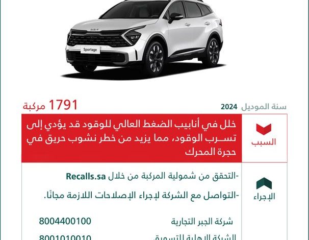 أعلنت وزارة التجارة استدعاء (1791) مركبة “KIA-Sportage” موديل 2024، لوجود خلل في أنابيب الضغط العالي للوقود، قد يؤدي إلى تسرب الوقود ويزيد من خطر نشوب حريق في حجرة المحرك.