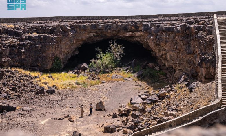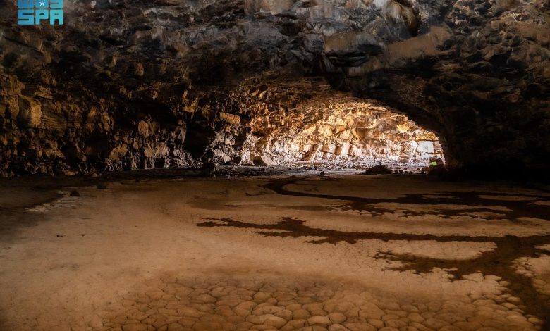 يُعدُّ كهف “أم جرسان” شمال المدينة المنورة أطول قناة أنبوبية بركانية معروفة في الجزيرة العربية، إذ يمتد لمسافة 1350 مترًا، بارتفاع 12 مترًا وعرض يقارب 45 مترًا.