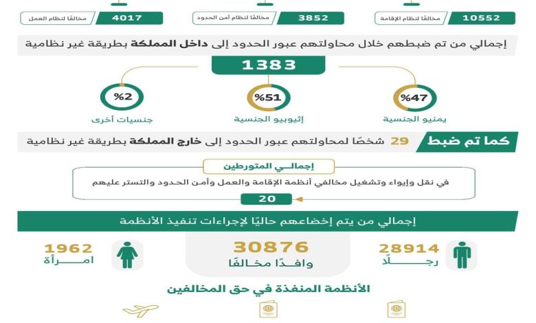 ثانيًا: بلغ إجمالي من تم ضبطهم خلال محاولتهم عبور الحدود إلى داخل المملكة (1383) شخصًا (47%) منهم يمنيو الجنسية، و(51%) إثيوبيو الجنسية، وجنسيات آخرى (02%)، كما تم ضبط (29) شخصًا لمحاولتهم عبور الحدود إلى خارج المملكة بطريقة غير نظامية.