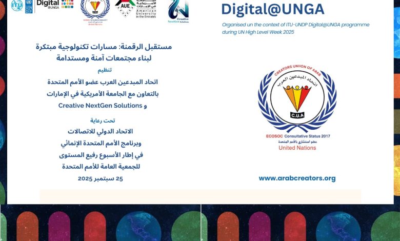 أطلق اتحاد المبدعين العرب – عضو الأمم المتحدة – منصة حوار دولية من دبي بعنوان “مستقبل الرقمنة: مسارات تكنولوجية مبتكرة لبناء مجتمعات آمنة ومستدامة”، وذلك ضمن برنامج Digital@UNGA المقام في إطار الأسبوع رفيع المستوى للجمعية العامة للأمم المتحدة 2025، وبرعاية كل من الاتحاد الدولي للاتصالات (ITU) وبرنامج الأمم المتحدة الإنمائي (UNDP)، وبالتعاون مع NextGen Creative Solutions.