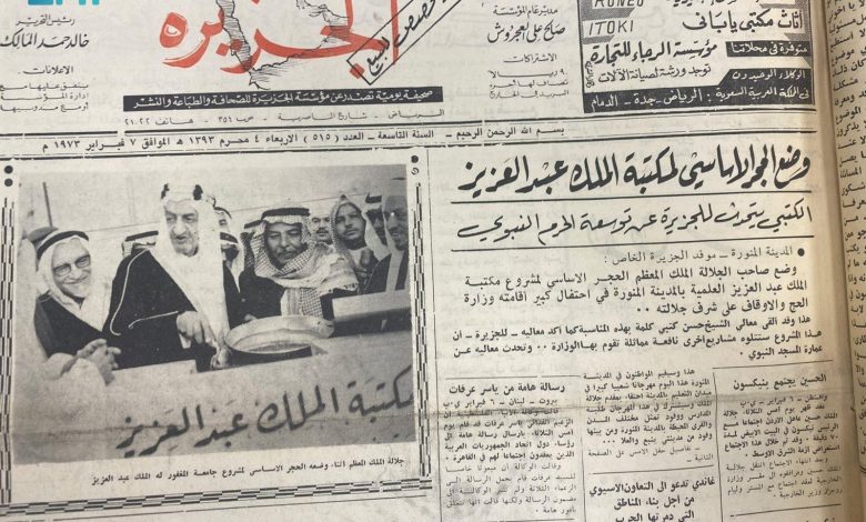 وفي السياق نفسه، شهد مطلع ذلك العام حدثًا مفصليًّا آخر تمثل في وضع الملك فيصل حجر الأساس لمشروع مكتبة الملك عبدالعزيز بالمدينة المنورة (3 المحرّم 1393هـ/ 6 فبراير 1973م)، في احتفال رسمي حضره عدد من أصحاب السمو وكبار المسؤولين, وتضم المكتبة إلى قاعاتها المختلفة قاعة خاصة بالمخطوطات والكتب النادرة؛ لتغدو منارة علمية وثقافية تحفظ التراث وتخدم الباحثين.