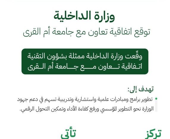 وقَّعت وزارة الداخلية ممثلة بشؤون التقنية اتفاقية تعاون مع جامعة أم القرى؛ تهدف إلى تطوير برامج ومبادرات علمية واستشارية وتدريبية تُسهم في دعم جهود الوزارة نحو التطوير المؤسسي، ورفع كفاءة الأداء، وتمكين التحول الرقمي.
