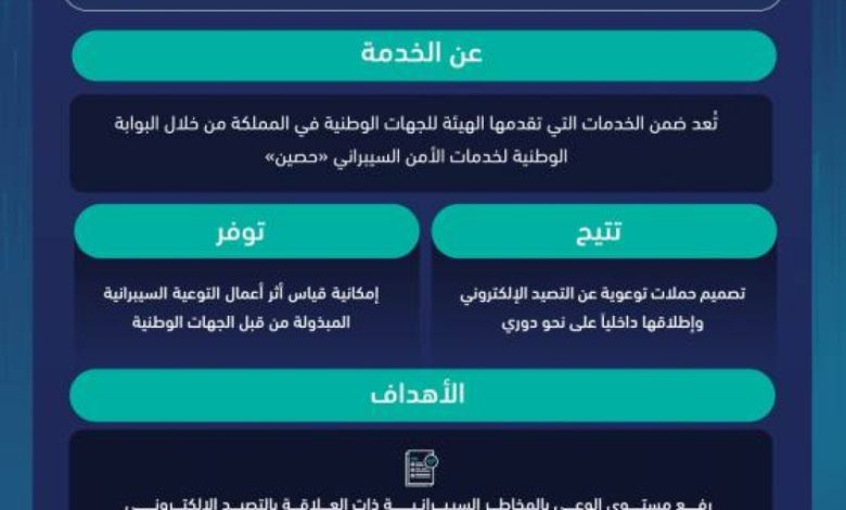 وتأتي خدمة “التصيد الإلكتروني” في إطار العمل التشاركي مع الجهات الوطنية لرفع مستوى الوعي بالأمن السيبراني، وضمن الخدمات التي تقدمها الهيئة الوطنية للأمن السيبراني من خلال البوابة الوطنية لخدمات الأمن السيبراني “حصين” المطورة بواسطة الذراع التقني للهيئة، الشركة السعودية لتقنية المعلومات “سايت”، لتعزيز آلية تقديم الخدمات السيبرانية وإدارتها وحماية البنى التحتية الوطنية، للوصول إلى فضاء سيبراني سعودي آمن وموثوق.