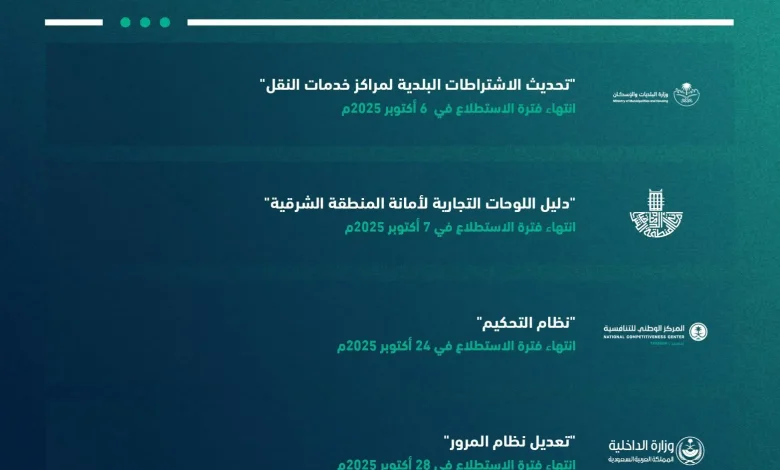 وتضمنت المشروعات المطروحة عبر المنصة، مشروع (تحديث الاشتراطات البلدية لمراكز خدمات النقل)؛ الذي تهدف من خلاله وزارة البلديات والإسكان إلى تسهيل عملية رقابة وتتبع سير المركبات والناقلات في المدن؛ بهدف المحافظة على نظافة المدن، وينتهي الاستطلاع على المشروع بتاريخ 6 أكتوبر 2025م.