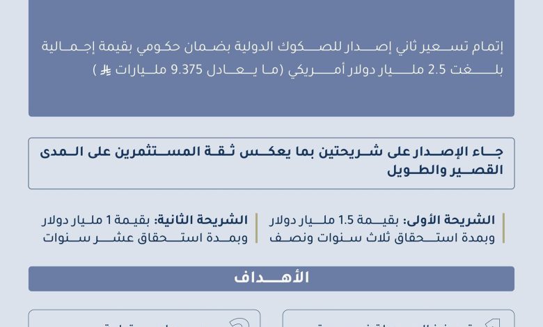 ويُعد هذا الإصدار جزءًا من برنامج الصكوك الدولية للشركة البالغ قيمته (5) مليارات دولار والمدرج في السوق الدولية للأوراق المالية (ISM) التابعة لبورصة لندن، بعد أن استكملت الشركة في فبراير الماضي تسعير إصدارها الأول بقيمة ملياري دولار.
