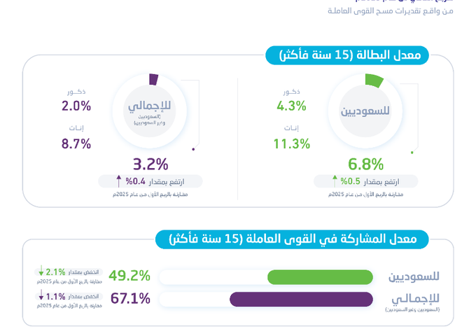 وعلى صعيد مؤشرات سوق العمل في الربع الثاني من عام 2025م المتعلقة بالسكان السعوديين (الذكور والإناث) في سن العمل الأساس (من 25 إلى 54 عامًا) فقد سجَّل معدل المشتغلين إلى السكان (63.3%)، كما سجَّل معدل المشاركة في القوى العاملة (67.3%)، وأفادت النتائج أن معدل البطالة بلغ (5.9%).