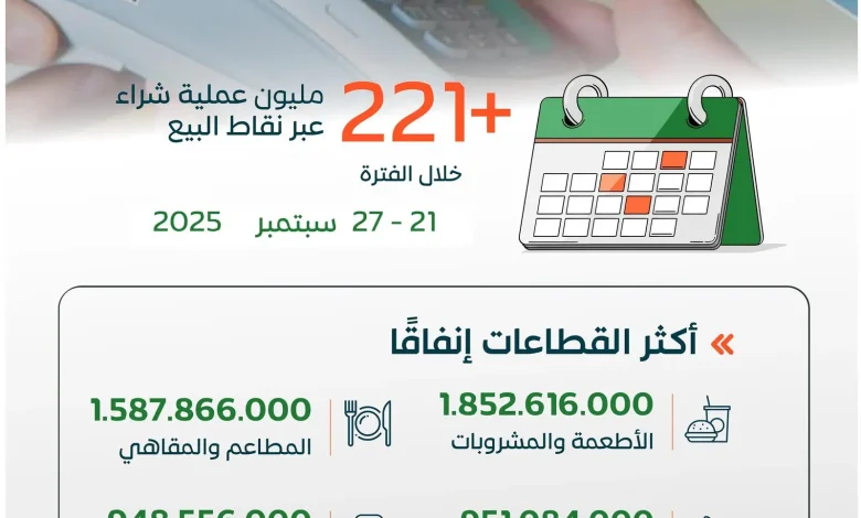 بلغ عدد عمليات نقاط البيع في المملكة خلال المدة من 21 – 27 سبتمبر 2025م, (221.433.000) عملية، بقيمة (12.771.870.000) ريال، مقابل (12.403.573.000) ريال، عن المدة السابقة نفسها.
