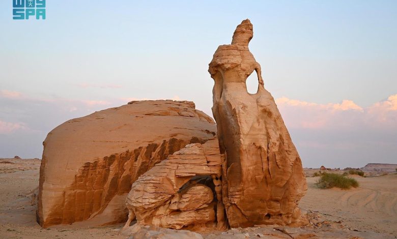 تقف “صخرة العروسة” شامخة خارج محافظة العُلا، بالقرب من تيماء، في تشكيلٍ جيولوجي نادر يُشبه عروسًا تُمسك بثوبها وسط الرمال.