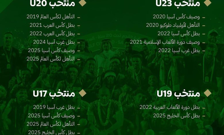 وجاءت إنجازات منتخبات الفئات السنية السعودية لتصل بالأخضر إلى العالمية، حيث يشارك المنتخب السعودي تحت (20) عامًا حاليًا في بطولة كأس العالم للشباب “تشيلي 2025″، ويستعد المنتخب السعودي تحت (17) عامًا للمشاركة في كأس العالم للناشئين التي تستضيفها قطر الشهر المقبل.