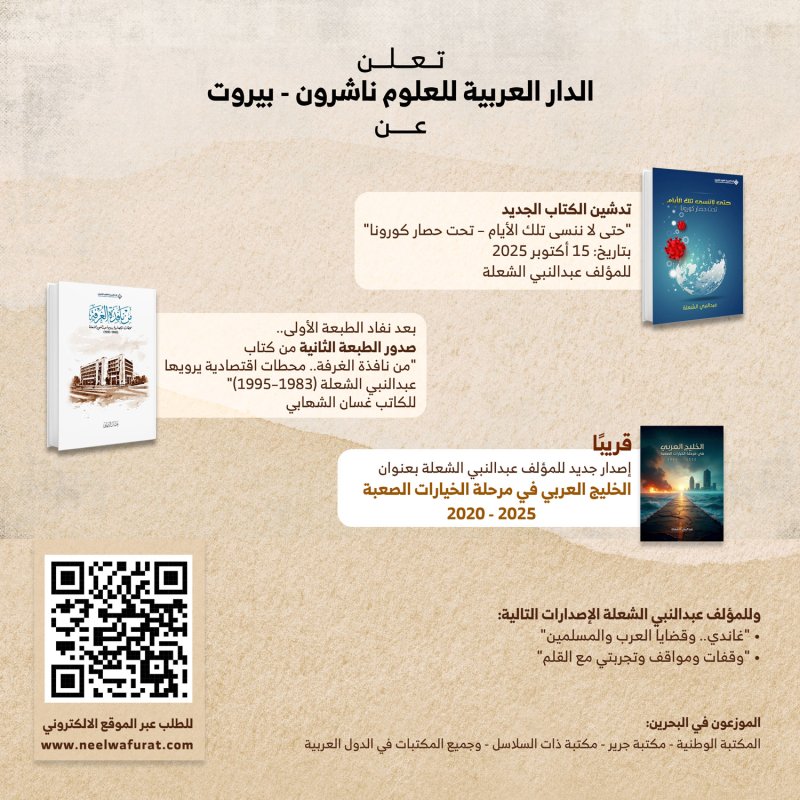 في إطار حرصها على إثراء الساحة الثقافية العربية بإصدارات نوعية تواكب التحولات الاقتصادية والاجتماعية والسياسية، أعلنت الدار العربية للعلوم ناشرون – بيروت عن طرح ثلاثة إصدارات جديدة للمؤلف البحريني عبدالنبي عبدالله الشعلة.