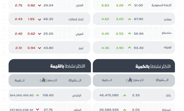 وكانت أسهم شركات مرافق، والإعادة السعودية، ومعادن، وساسكو، ولوبريف، الأكثر ارتفاعًا، أما أسهم شركات الأندية للرياضة، والبحري، واتحاد اتصالات، والعربي، وثمار، الأكثر انخفاضًا في التعاملات، وتراوحت نسب الارتفاع والانخفاض ما بين (9.97%) و(3.04%)، فيما كانت أسهم شركات باتك، وأمريكانا، وشمس، والأندية للرياضة، وكيان السعودية، هي الأكثر نشاطًا بالكمية، بينما كانت أسهم الراجحي، والرياض، ومعادن، وأرامكو السعودية، والإنماء هي الأكثر نشاطًا في القيمة.