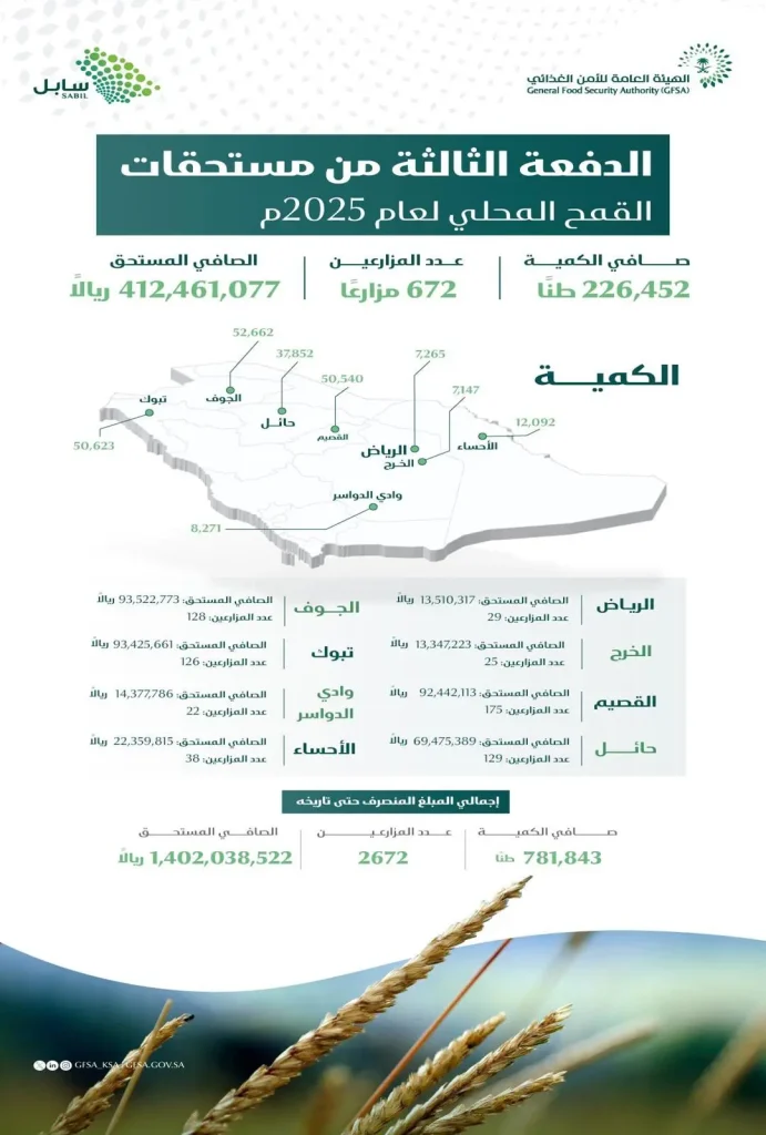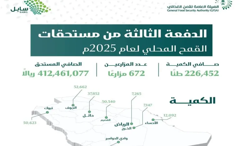 أعلنت الهيئة العامة للأمن الغذائي عن صرف مستحقات الدفعة الثالثة لمزارعي القمح المحلي، اللذين قاموا بتوريد الكميات المخصصة لهم لهذا الموسم 1446/1447هـ (2025م)، بفروع الشركة الوطنية لإمدادات الحبوب “سابل”، وإغلاق حساباتهم عبر المنصة الإلكترونية “محصولي”، وذلك حتى تاريخ 10/4/1447هـ الموافق 2/10/2025م.
