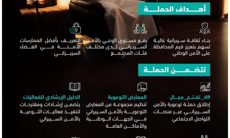 وتركّز الحملة على نشر الوعي بأهمية الأمن السيبراني وتعزيز السلوكيات السيبرانية الآمنة لمختلف الشرائح العمرية في المجتمع عبر مجموعة من المواد التثقيفية التي تتطرق إلى “التصيد الإلكتروني، وأهمية تفعيل أدوات الحماية من المخاطر السيبرانية، والتحقق الثنائي، والنسخ الاحتياطي، وثبيت التحديثات، والرقابة الأبوية، وكلمات المرور”، وغيرها من الموضوعات التي من شأنها الإسهام في حماية الفرد والمجتمع من المخاطر السيبرانية المتجددة.