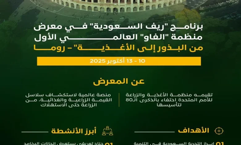 تشارك المملكة العربية السعودية، ممثلة في برنامج التنمية الريفية الزراعية المستدامة “ريف السعودية”، في المعرض العالمي الأول لمنظمة الأغذية والزراعة للأمم المتحدة “فاو” بعنوان “من البذور إلى الأغذية”، الذي تستضيفه العاصمة الإيطالية روما في باركو دي بورتا كابينا، خلال الفترة من 10 إلى 13 أكتوبر 2025، وذلك ضمن جهود المملكة لتعزيز مكانتها الريادية عالميًا في دعم وتطوير القطاع الزراعي المستدام، ودعم صغار المزارعين، والترويج للمنتجات الريفية في الأسواق الدولية.