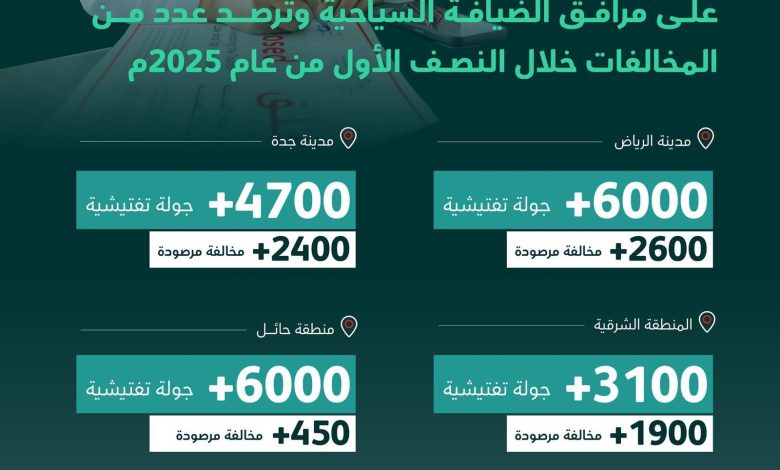 وزارة السياحة تُنفّذ أكثر من 47 ألف جولة رقابية على مرافق الضيافة السياحية وترصد 21 ألف مخالفة خلال النصف الأول من عام 2025