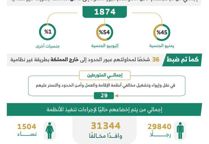 ثانيًا: بلغ إجمالي من تم ضبطهم خلال محاولتهم عبور الحدود إلى داخل المملكة (1874) شخصًا (45%) منهم يمنيو الجنسية، و(54%) إثيوبيو الجنسية، وجنسيات آخرى (1%)، كما تم ضبط (36) شخصًا لمحاولتهم عبور الحدود إلى خارج المملكة بطريقة غير نظامية.