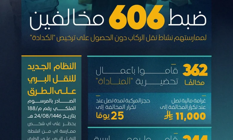واصلت الفرق الرقابية في الهيئة العامة للنقل جولاتها التفتيشية، وضبطت خلال الفترة من السبت حتى الجمعة الموافق 4 – 10 أكتوبر الجاري، 606 مخالفين، أوقعت بحقهم الإجراءات النظامية التي تتضمن حجز المركبات وغرامات مالية؛ لممارستهم نشاط نقل الركاب دون الحصول على ترخيص “الكدادة”، وذلك في مختلف مناطق المملكة، بالتعاون مع عدد من الجهات المعنية.