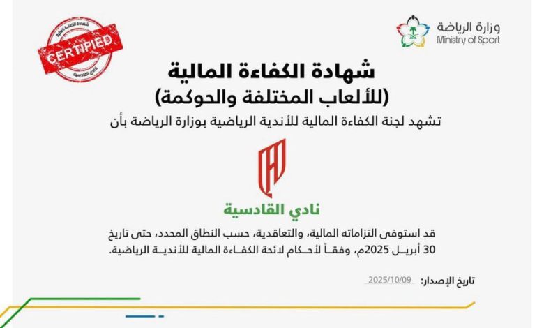 وتُعد هذه الشهادة تأكيدًا على التزام نادي القادسية بتطبيق أعلى معايير الانضباط المالي والإداري، وحرصه على تحقيق التوازن بين الأداء الرياضي والحوكمة الفاعلة، بما يضمن استمرار تطوير منظومة الألعاب المختلفة داخل النادي وفق أسس احترافية ومستدامة.