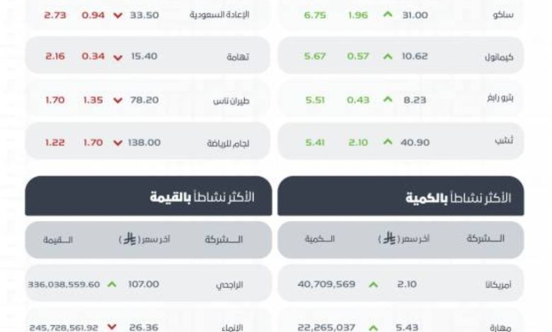 وكانت أسهم شركات سهل، وساكو، وكيمانول، وبترو رابغ، وتشب الأكثر ارتفاعًا، أما أسهم شركات نسيج، والإعادة السعودية، وتهامة، وطيران ناس، ولجام للرياضة الأكثر انخفاضًا في التعاملات، وتراوحت نسب الارتفاع والانخفاض ما بين (9.99%) و(3.54%)، فيما كانت أسهم شركات أمريكانا، ومهارة، وباتك، وشمس، وبترو رابغ، هي الأكثر نشاطًا بالكمية، بينما كانت أسهم الراجحي، والإنماء، وأرامكو السعودية، والمواساة، وأكوا باور هي الأكثر نشاطًا في القيمة.