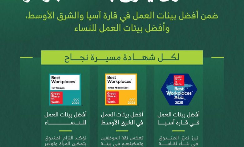 كما نال الصندوق، شهادة أفضل بيئات العمل في الشرق الأوسط؛ لتميزه في تمكين الموظفين، وترسيخ الثقة والاحترام المتبادل، وتعزيز التعاون والمسؤولية الاجتماعية، مما يجعله نموذجًا رائدًا يعكس تطور بيئات العمل في المنطقة.