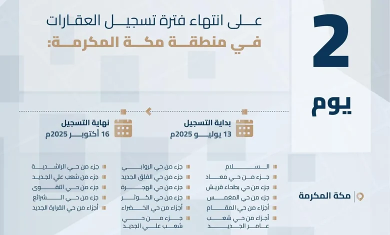 وبيّنت “الهيئة” أنّ التسجيل العيني للعقار سينتهي بمنطقة مكة المكرمة لـ50,259 قطعة عقارية بمدينة مكة المكرمة ومحافظة الجموم، ضمن نطاق الأحياء التالية: حي السلام، جزء من حي الروابي، جزء من حي الراشدية، جزء من حي معاد، جزء من حي الفلق الجديد، جزء من شعب علي الجديد، جزء من حي بطحاء قريش، جزء من حي الهجرة، جزء من حي التقوى، جزء من حي شعب علي الجديد، جزء من حي المغمس، جزء من حي الكوثر، جزء من حي الشرائع، أجزاء من حي المقام، أجزاء من حي الخضـراء، أجزاء من حي القرارة الجديد، أجزاء من حي شعب عامر الجديد، مخطط المبارك بالريان، مخطط ذوي الدخل المحدود المعدل بهدى الشام، مخطط إسكان مدينة الجموم.